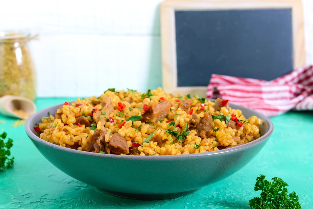 Bulgur cu carne de pui și legume în bol, un borcan cu bulgur, o lingură de lemn și frunze de pătrunjel