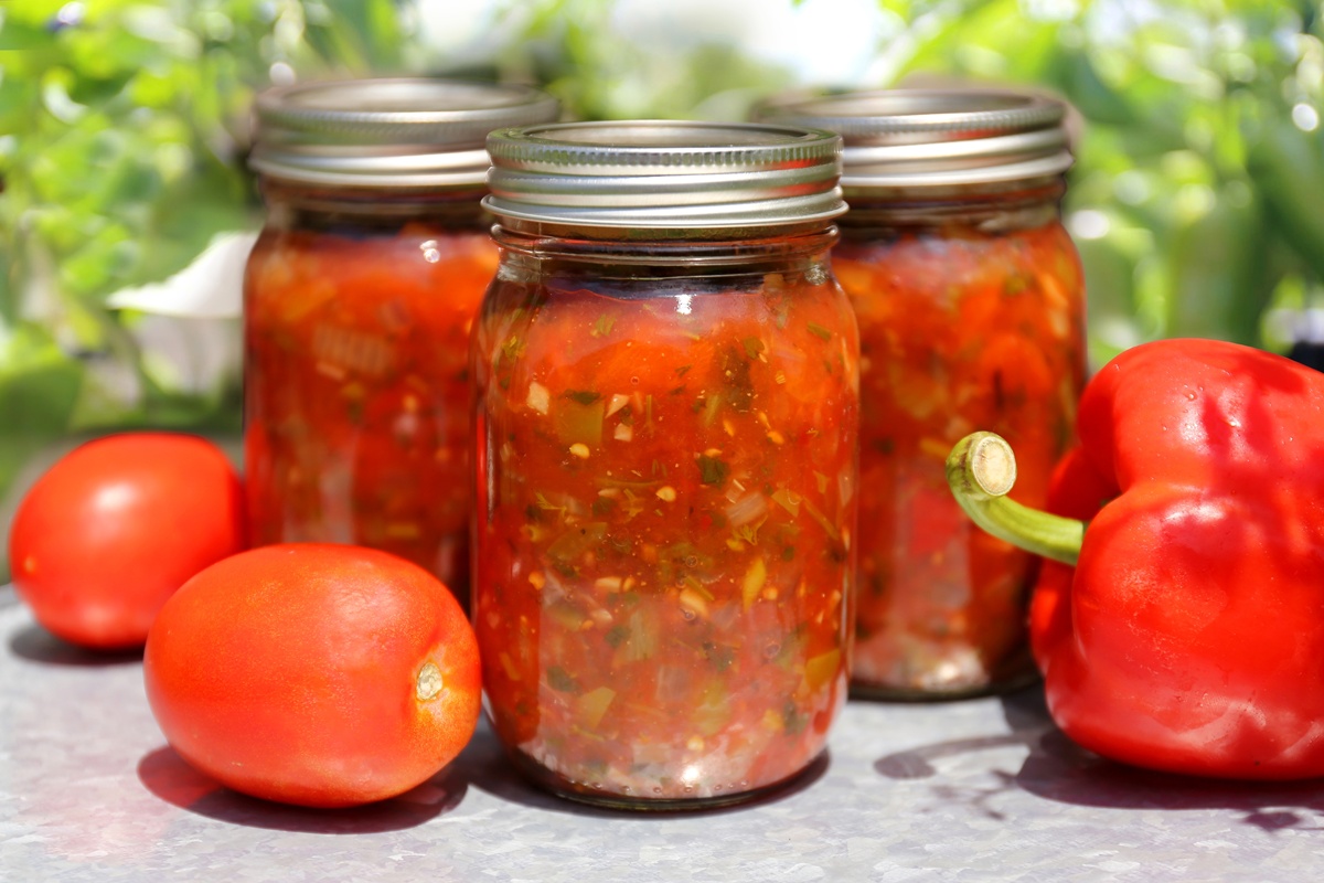 Conservă de roșii cu ceapă, ardei și verdeață în borcane, alături de o roșie și un ardei roșu