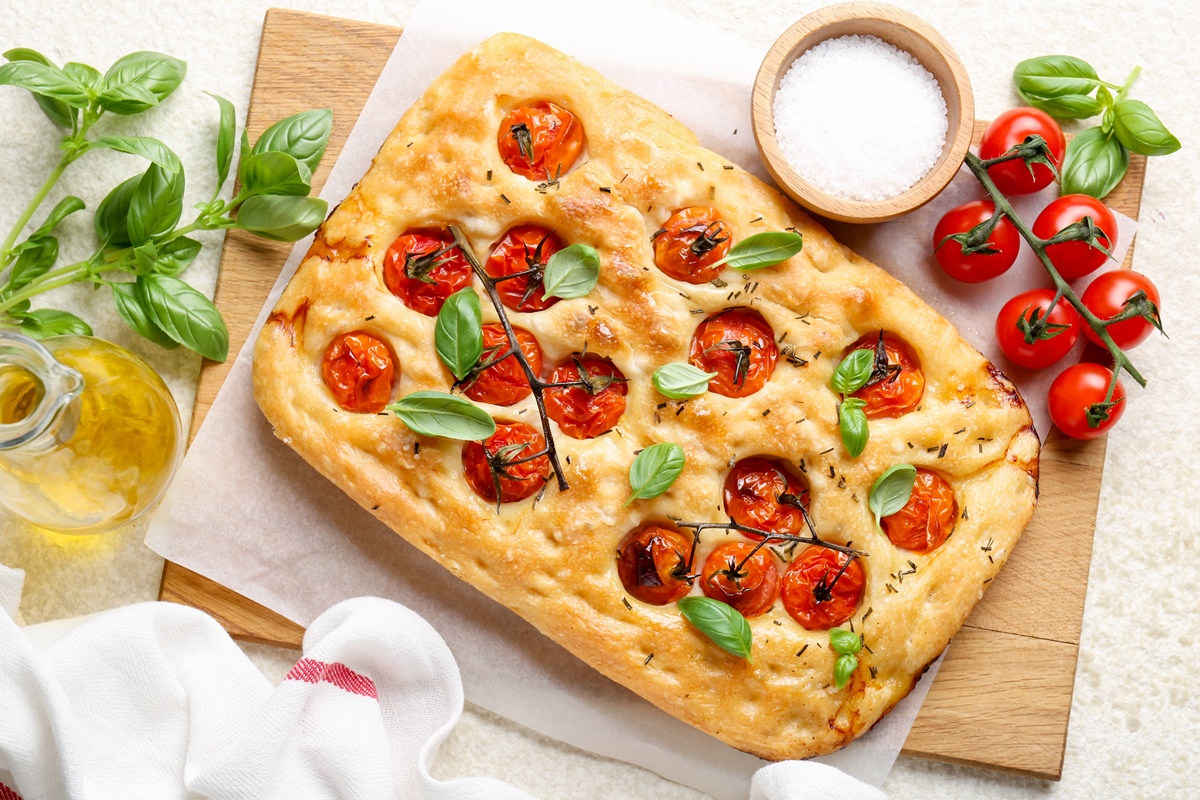 Focaccia cu roșii cherry și busuioc